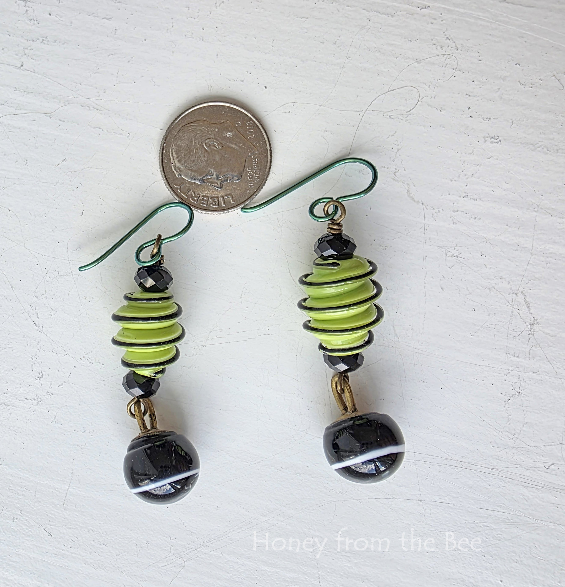 These fun earrings dangle 2.25" from the top of the earwire to the bottom of the button dangle.