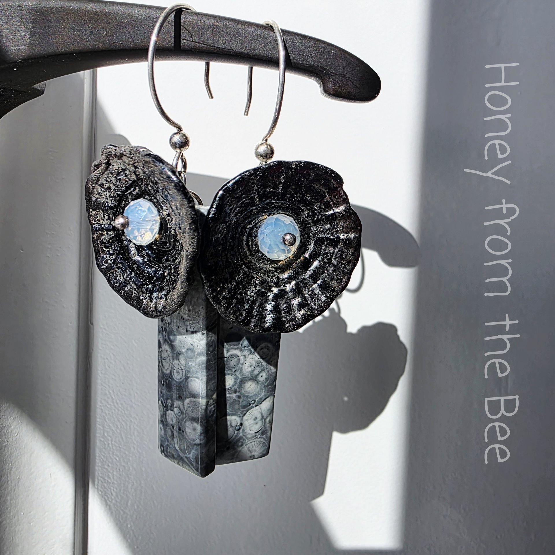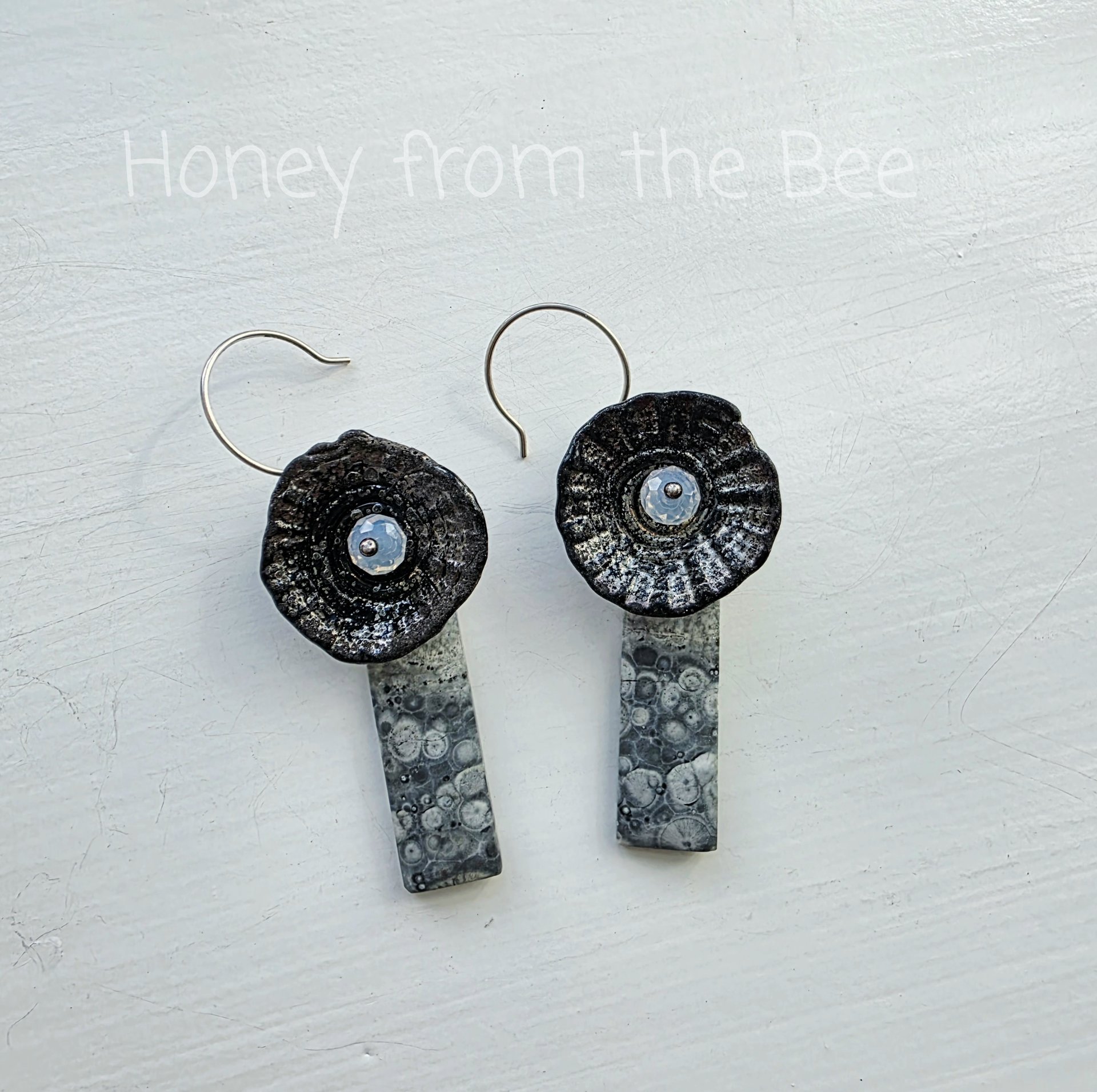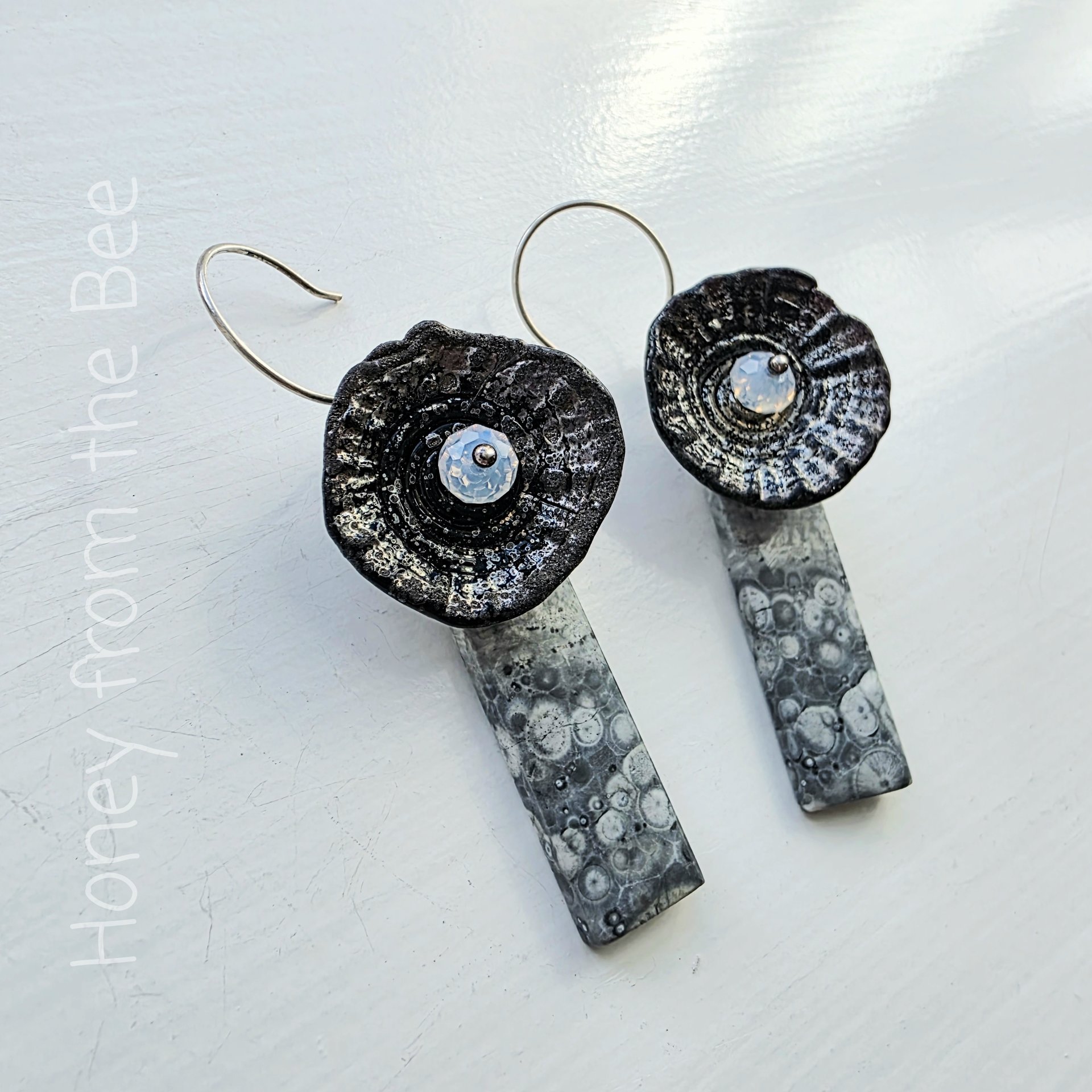 These grey, black and white artisan earrings are dramatic.