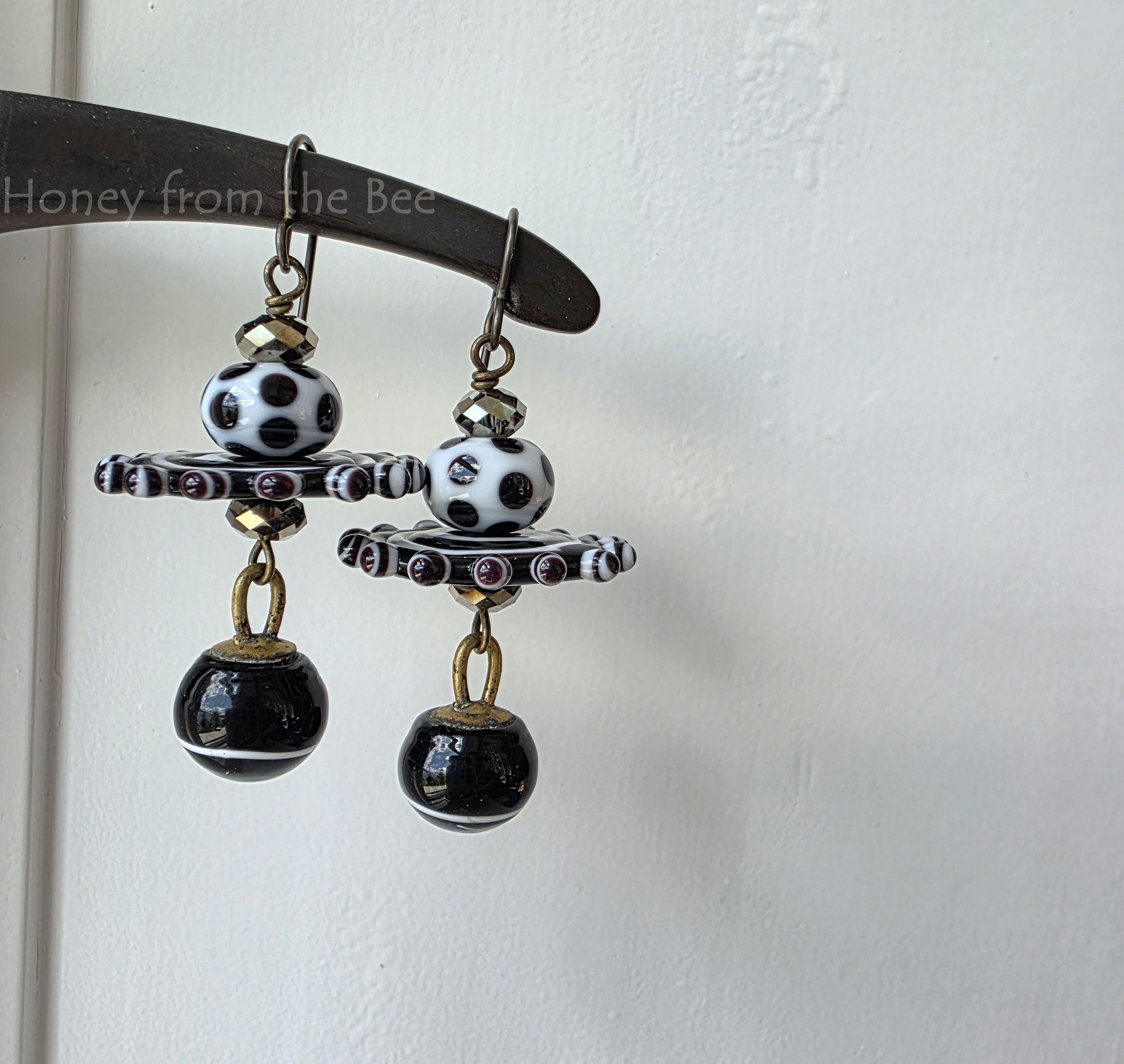 These lovely earrings dangle 2" from the top of the earwire to the bottom of the button dangle