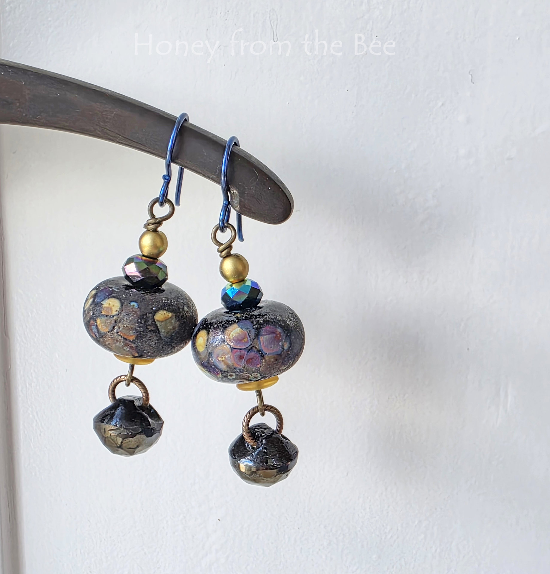 Under fire is how these lampwork beads were created. Not just a lampworker's flame, but then dropped in an oxygen deprived container which creates these wonderful reactions to the glass. It's called raku. I've added faceted antique buttons as drops and a beautiful peacock colored crystal, too.